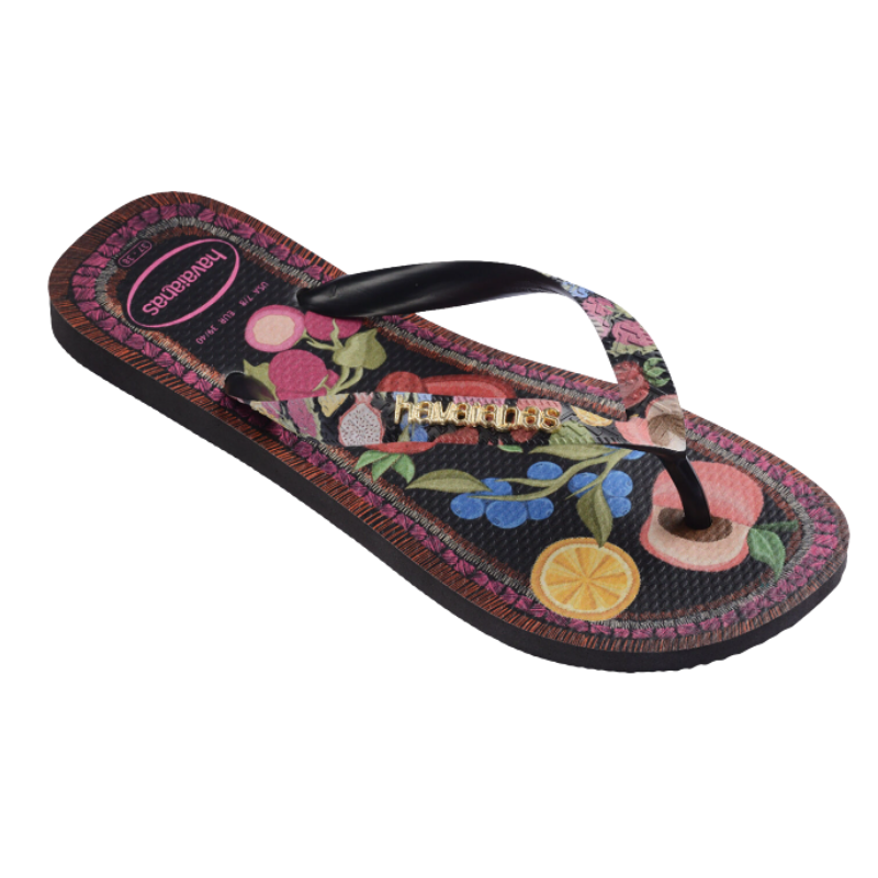 כפכפי אצבע לנשים של הוואינאס (Havaianas) מדגם Slim Tropicalia בעלי הדפס פירות טרופיים על המדרס ורצועות גומי דקות. הכפכפים מצוידים בסוליית גומי בעלת טקסטורת אורז למניעת החלקה...