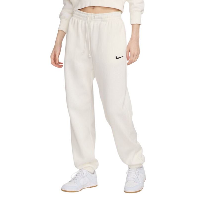 מכנסי פוטר ארוכים לנשים של NIKE בצבע לבן — גזרת ג'וגר רחבה ומותן גבוהה לנוחות יום-יומית. בד סרוג רך (80% כותנה, 20% פוליאסטר), שני כיסים ומיתוג...