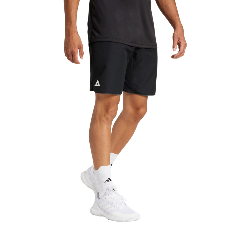 מכנסיים קצרים לגברים בכחול כהה — גזרה ישרה ואורך קצר שמתאימים לריצות ולאימונים. בד פוליאסטר ארוג עם מתיחות בינונית-גבוהה ונידוף זיעה, שני כיסים ולוגו קטן בצד.