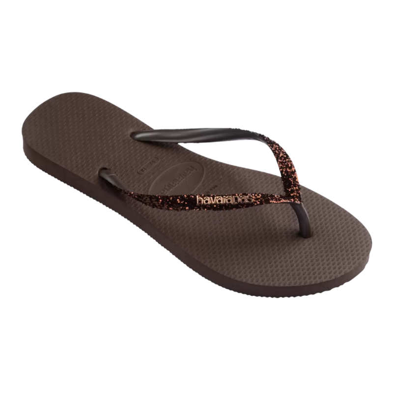 כפכף אצבע Slim Glitter לנשים של HAVAIANAS בגוון חום עם מראה מטאלי עדין. עיצוב שטוח, קליל ופתוח, שמתאים ליום-יום ולמראה קז'ואלי פשוט ונוח.