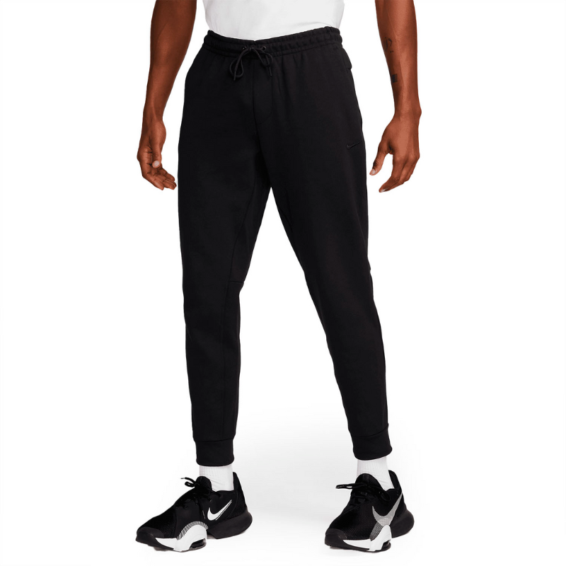 מכנסי ג'וגר NIKE לגברים בצבע אפור מלנג' — גזרה צמודה, מותן בגובה בינוני ואורך רגיל. בד סרוג 100% פוליאסטר עם מתיחה נמוכה‑בינונית, שני כיסים וסמל NIKE...