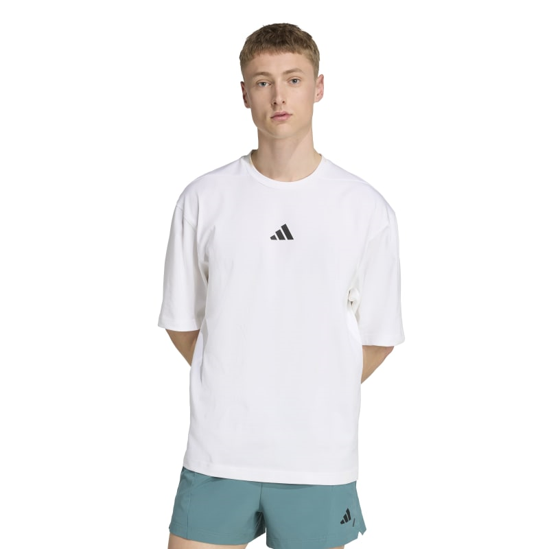 חולצת טי-שירט קצרה לגברים מבית ADIDAS בצבע לבן, בגזרה אוברסייז נוחה. כוללת מפתח צוואר עגול, שרוולים קצרים ולוגו קטן ומרכזי בחזה. מתאימה ללוק יומיומי וקליל.