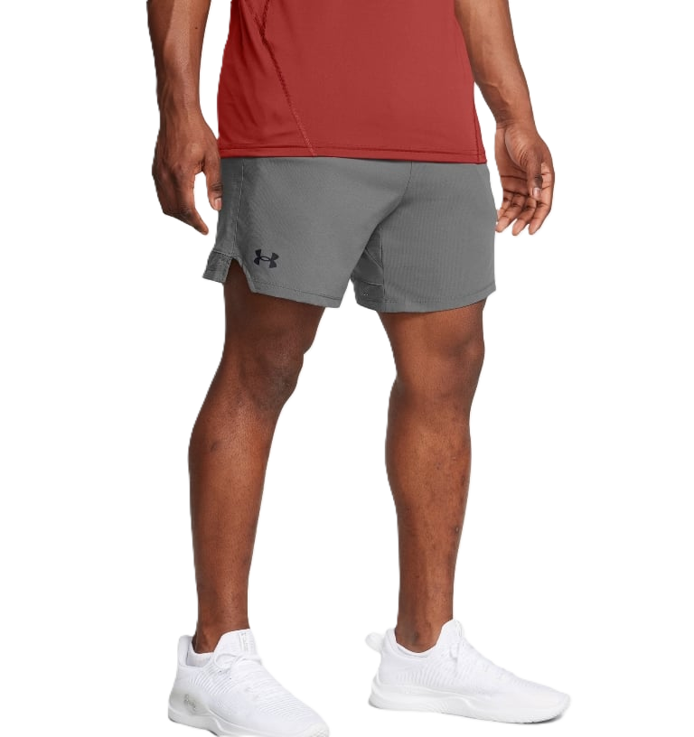 מכנסי ספורט קצרים לגברים של Under Armour באפור — גזרה ישרה, אורך קצר ומותן בגובה בינוני. עשויים 100% פוליאסטר קל עם נידוף זיעה ומתיחה בינונית, כוללים...