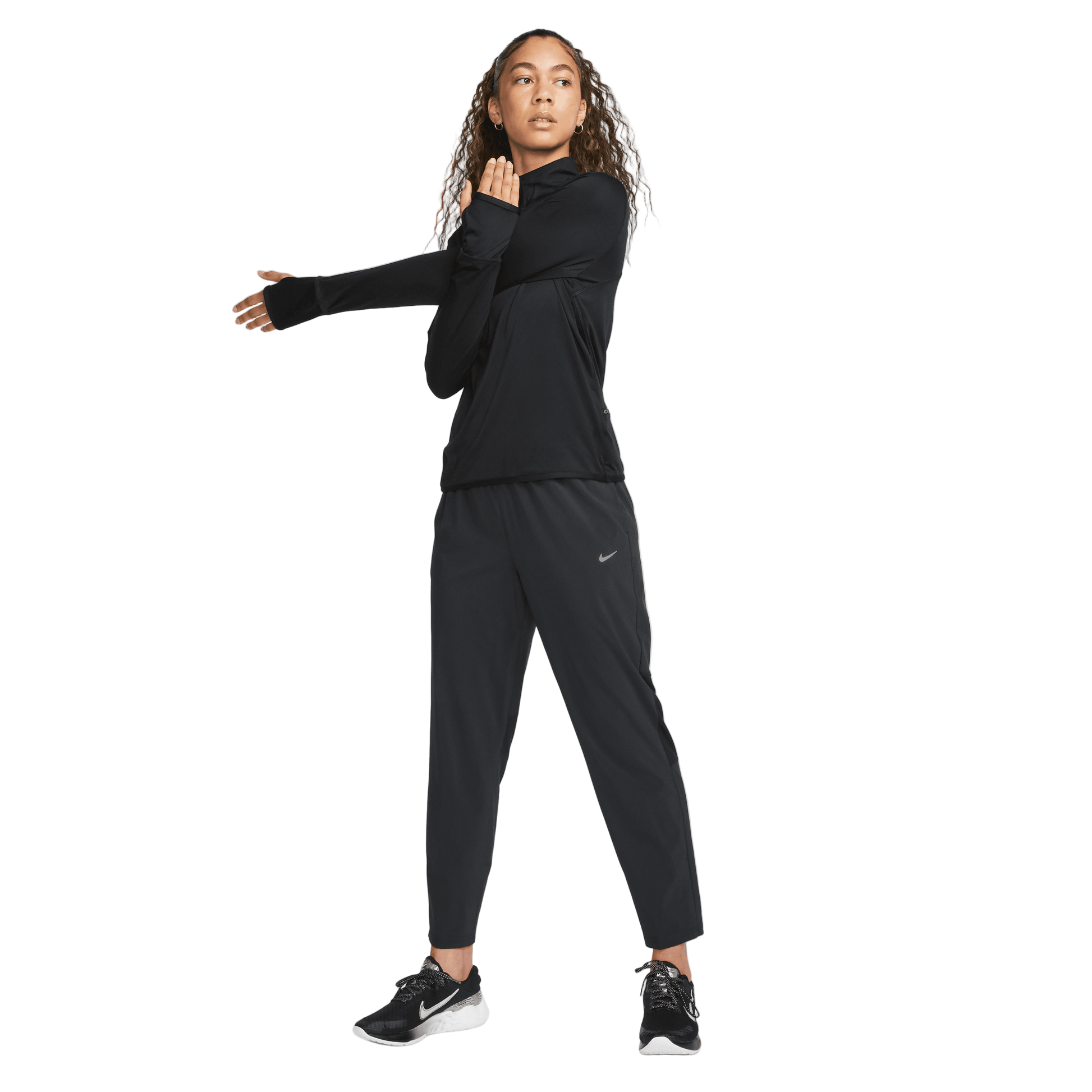 מכנסי ספורט 7/8 לנשים — ג'וגר בסגנון סלים עם מותן גבוהה ואורך קרופי. גזרה צמודה שמשלבת מראה אתלטי ושימושי: כיסים צדדיים כפולים לשמירת חפצים בזמן ריצה או אימון, עיצוב חלק ונקי שמתאים לטרנד האת'ליז'ר. עשויים מבד ניילון סרוג עם מתיחה גבוהה וטכנולוגיית נידוף זיעה לביצועים נוחים ותנועה חופשית. לוגו קטן בסטמפה לדגם דיסקרטי שמוסיף טאץ' ספורטיבי.